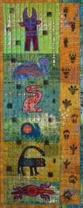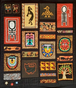 2014Mixed media met Afrikaanse afbeeldingen. Dit quiltje is gemaakt nav een thema van het quiltersgilde "Sporen".