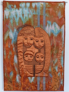 2017Deze quilt is gemaakt nav een afrikaans beeld dat ik ergens in een tuin zag staan. Het gezinnetje sprak mij erg aan. Zo'n gezin heb ik ook. Het middenstuk is van satijn, de rest van diverse verschillende stoffen. Er is met de machine geborduurd, maar ook heel veel met de hand.