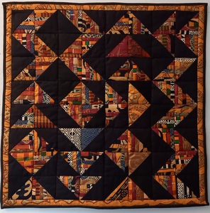 2001Ik heb met mijn afrikaanse stoffen zitten spelen. De meeste driekhoekjes bestaan uit strookjes. De zwarte stof geeft rust en helderheid.