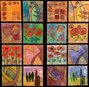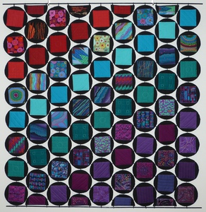 2013Piepkleine vierkante quiltjes ( 9 x 9 cm) op een rondje. Veelal met de hand geborduurd. De quilt is opgebouwd in verschillende kleuren, die diagonaal verlopen.