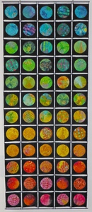 2012Piepkleine ronde quiltjes (rond 10) op een vierkant. Het zijn net wereldbollen. In een varieteit aan (wereld)kleuren. de meeste cirkels zijn met de hand geborduurd, de anderen dus op de machine.