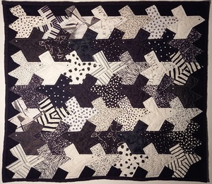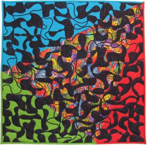 2011Geïnspireerd door MC Escher. Net als bij "Dag en Nacht" vliegen de vogels twee kanten op. Gemaakt met de Engelse techniek. Om kartonnetjes en die later aan elkaar genaaid
