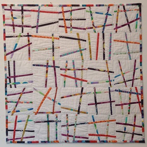 2018Bij het 35-jarig bestaan van het Quiltersgilde werd een thema uitgeschreven voor quilts die op de grote tentoonstelling zouden hangen. Men kreeg een envelope met 4 stofjes daarin. Maak een quilt waar deze stofjes inzitten. Volkomen niet mijn smaak. Had ook totaal geen inspiratie. Uiteindelijk dacht ik; Als ik die stofjes nu in smalle reepjes snij en aanvul met mijn eigen stofjes... Het is deze Mikado quilt geworden en ik zou nu niet meer weten wat de verplichtte stofjes zijn.