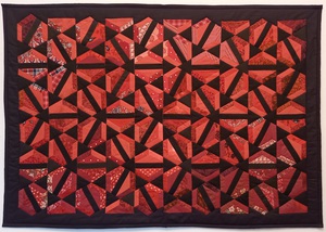 2005Gemaakt n.a.v. een boek van Olga Prins. In mijn beginperiode van de artquilts maakte ik weleens iets na van iemand. Gewoon om het in mijn vingers te krijgen. Ik heb wel altijd de maker van het origineel op de hoogte gesteld. Dit werk is om kartonnetjes genaaid en later aan elkaar gezet. Ik geloof dat er 64 kleuren rood in zitten.